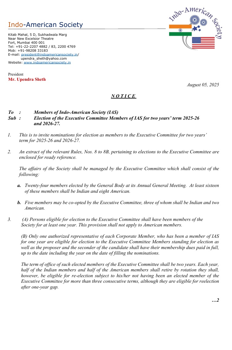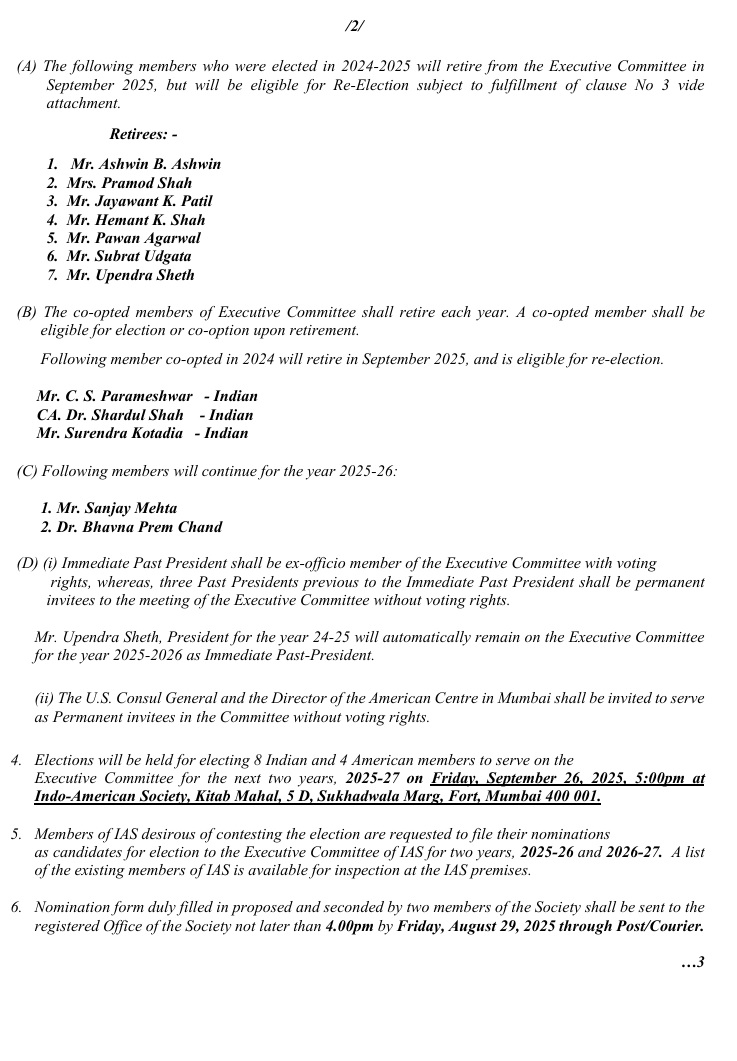 4. Elections will be held for electing 8 Indian and 4 American members to serve on the Executive Committee for the next two years, 2025-27 on Friday, September 26, 2025, 5:00pm at Indo-American Society, Kitab Mahal, 5 D, Sukhadwala Marg, Fort, Mumbai 400 001.
