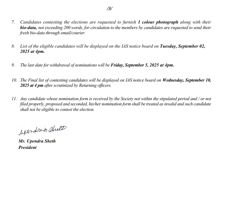 10. The Final list of contesting candidates will be displayed on IAS notice board on Wednesday, September 10, 2025 at 4 pm after scrutinised by Returning officers.