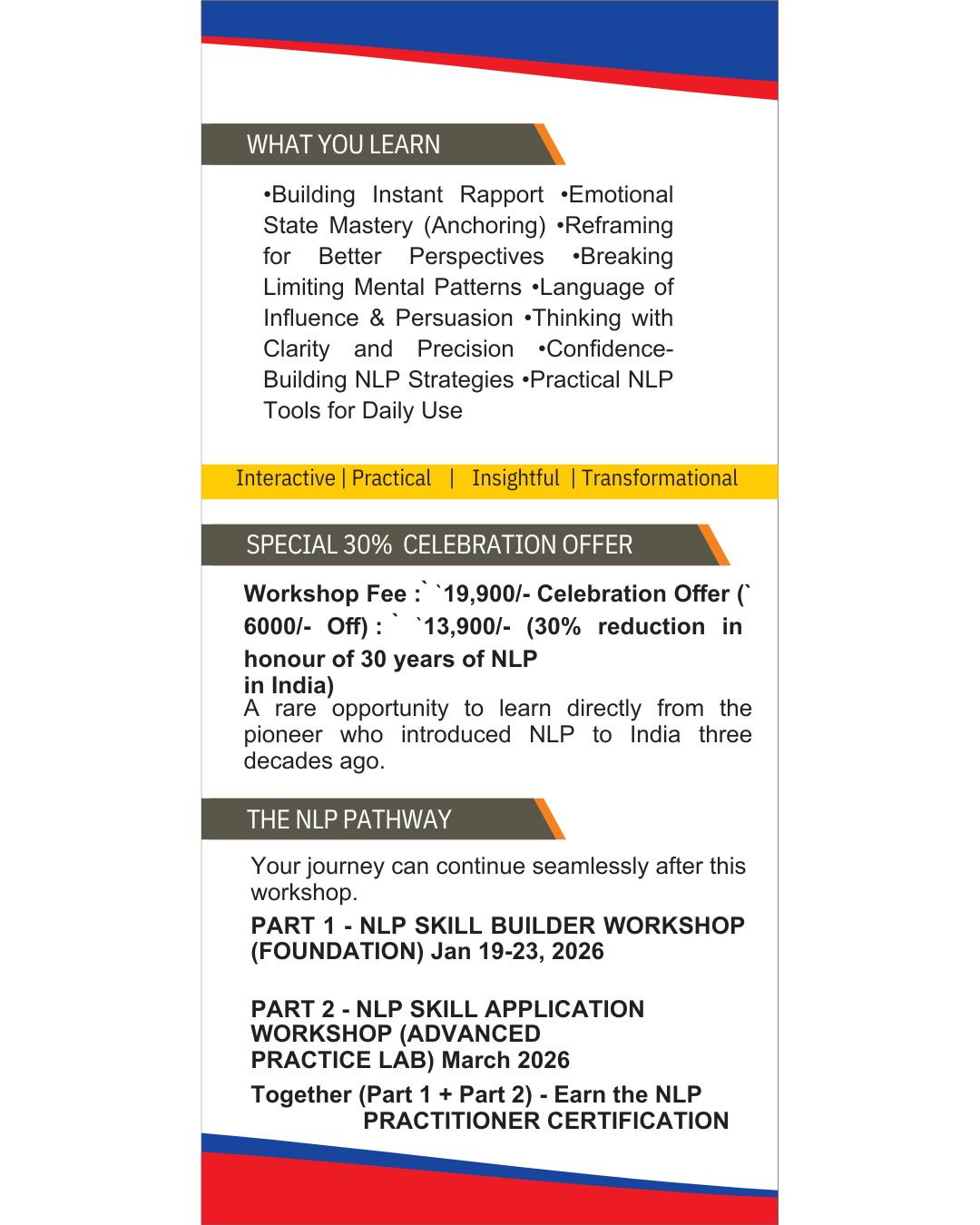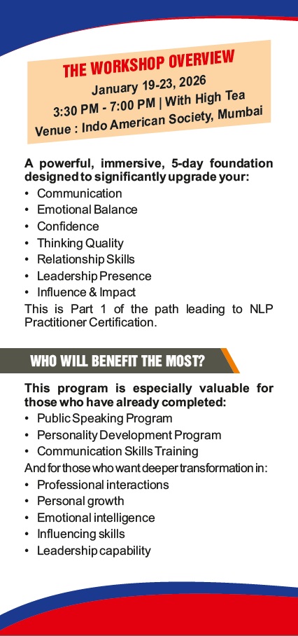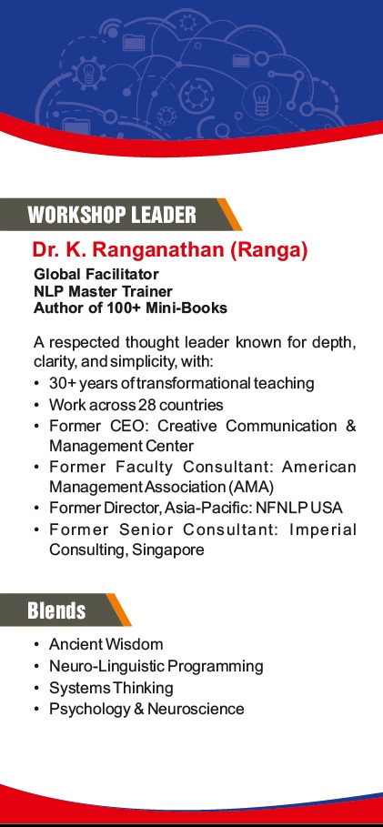 We are pleased to announce a new workshop titled “The NLP Skill Builder” led by Workshop Leader Dr. K. Ranganathan.